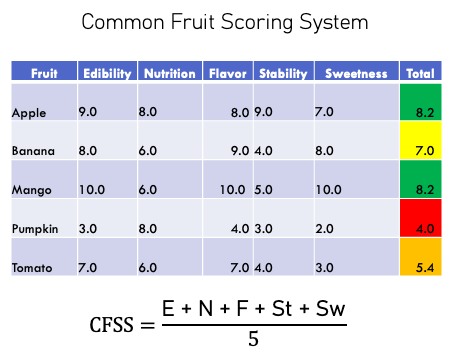 To make that point in the talk, I introduced what I call the Common Fruit Scoring System.