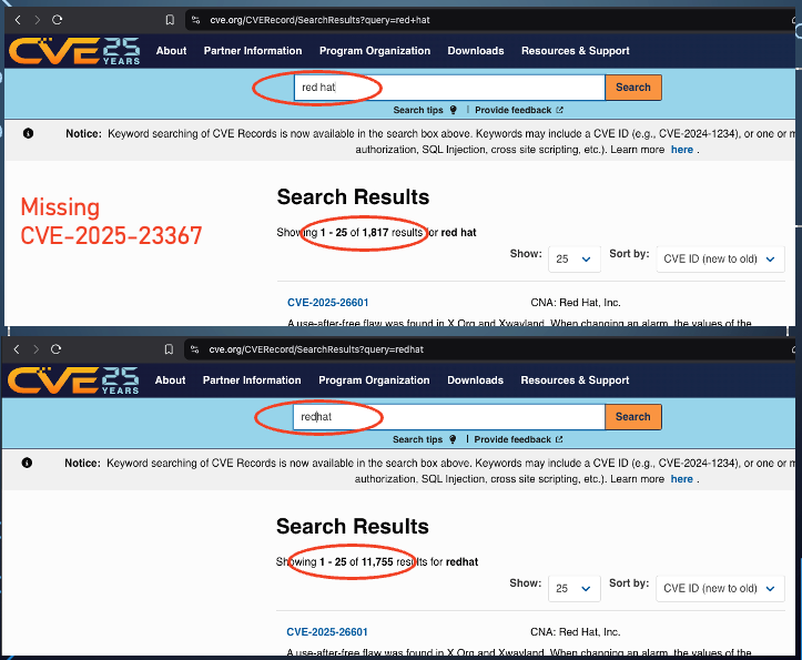 Try searching “Red Hat” in the NVD database. Depending on whether you type “Red Hat,” “RedHat,” “red hat,” “Red Hat Inc.,” or “redhat.com,” you’ll get anywhere between 1,817 and 11,755 results.