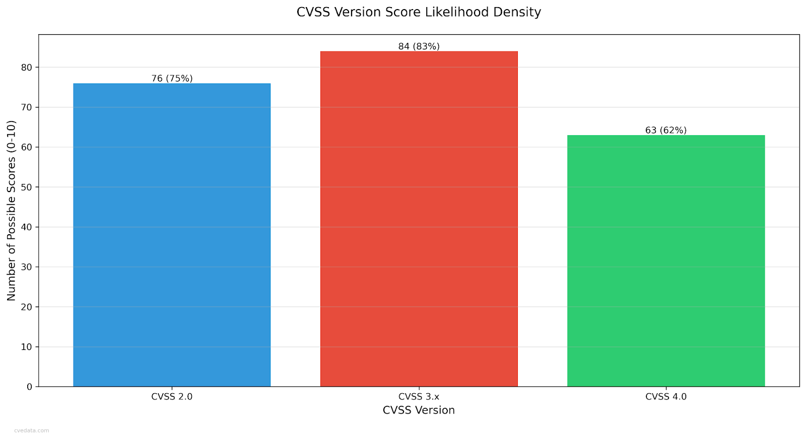This graph shows that there are numerical score values that do not have any instances of occurrence. That’s right: some CVSS scores are mathematically unreachable. It’s an artifact of the formula itself due to rounding and an arbitrary 1.08 multiplier. The system was built to look statistically normal, but the math underneath is arbitrary.