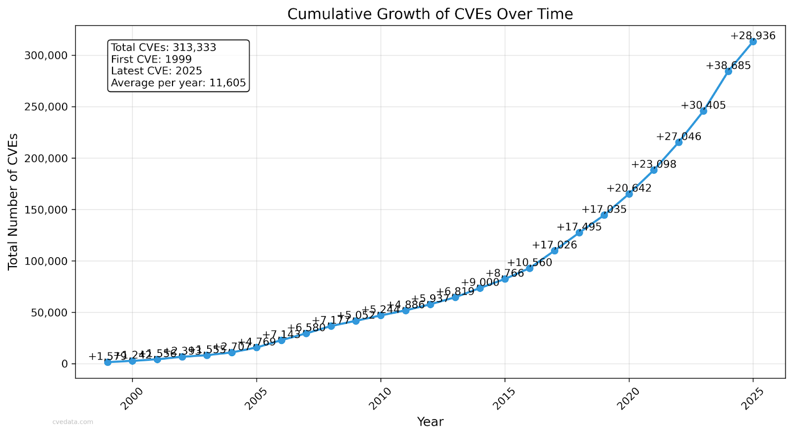 I started this whole presentation to answer a single question: why are we still getting hacked after spending billions of dollars on network and application security? We now have over 313,000 CVEs, growing by about 1,000 per week.
