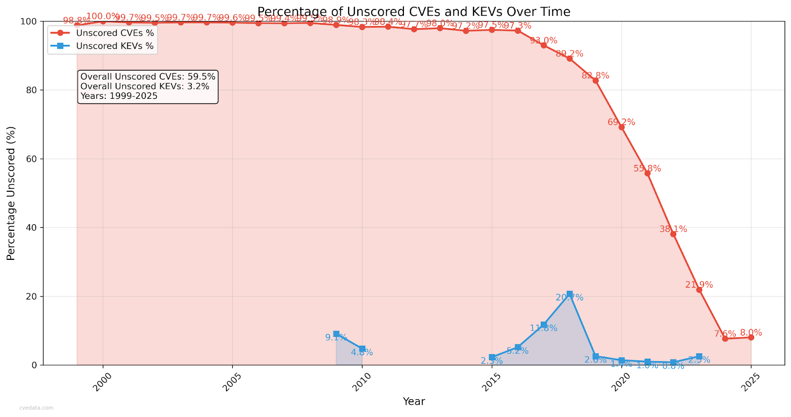 Unscored CVEs are finally dropping below 9%, which is progress. This was probably the one good graph I had to show. This just shows that the CNAs are actually doing their jobs for now, which is great. Legacy vulns aren’t getting much love but the new ones seem to.