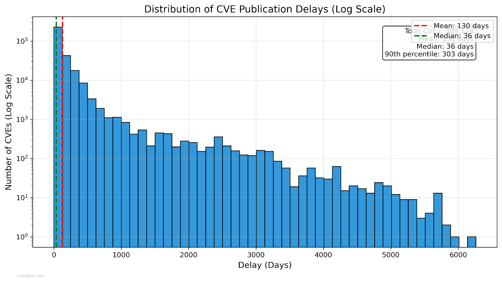 The median time from discovery to publication is 36 days, but the mean is 130 days — and some take over 6,000 days (16 years).